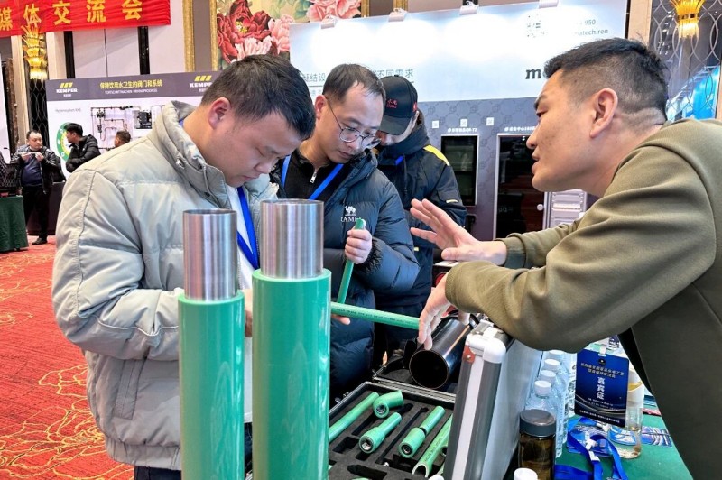 现场团队进行深度讲解,城家覆塑不锈钢SPNF-(PP-R)管道系统完美结合了PP-R管和不锈钢管的优越性能。
