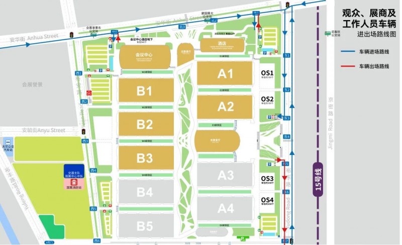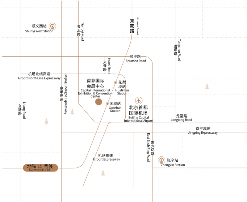 14号线-望京站-换乘15号线-国展站(前往首都国际会展中心“东登录厅”)-花梨坎站(前往首都国际会展中心“北登录厅”或首都国际会议中心)
